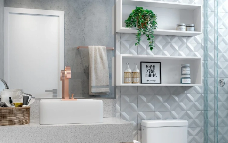 Assim como as prateleiras convencionais, os nichos servem para depositar alguns itens da sua decoração – e são uma ótima dica para preencher paredes vazias. De forma singular, você pode fazer como o exemplo abaixo e apostar em nichos com formatos diferentes: em seu interior, coloque objetos que representem você, como livros, plantas e itens menores. Neste projeto da Italínea, foram utilizados alguns nichos para contribuir com a decoração do banheiro.