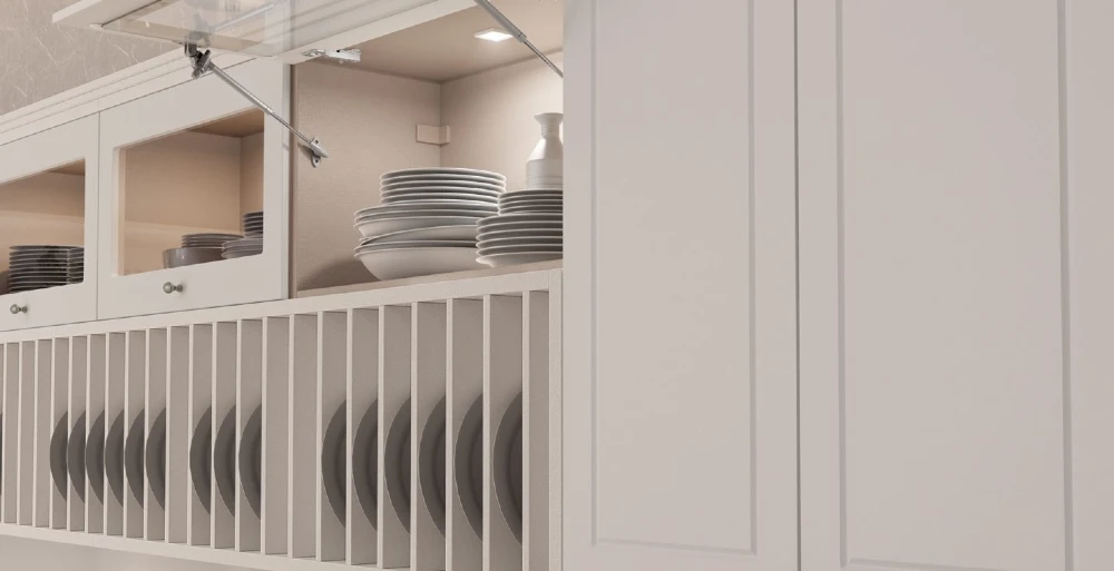 Ter uma iluminação boa é indispensável em uma cozinha confortável. Contudo, nem sempre é possível garantir que a luz natural cumpra inteiramente esse papel. Por isso, a dica é investir em alguns recursos, como a iluminação pontual nos móveis! Essa dica é ótima porque além de valorizar mais a mobília, também dá um novo papel para aqueles jogos de taças e pratos que ficam expostos em prateleiras ou armários aéreos com portas de vidro: por terem mais destaque através da luz, deixam de ser apenas objetos de cozinha e ganham caráter de decoração.