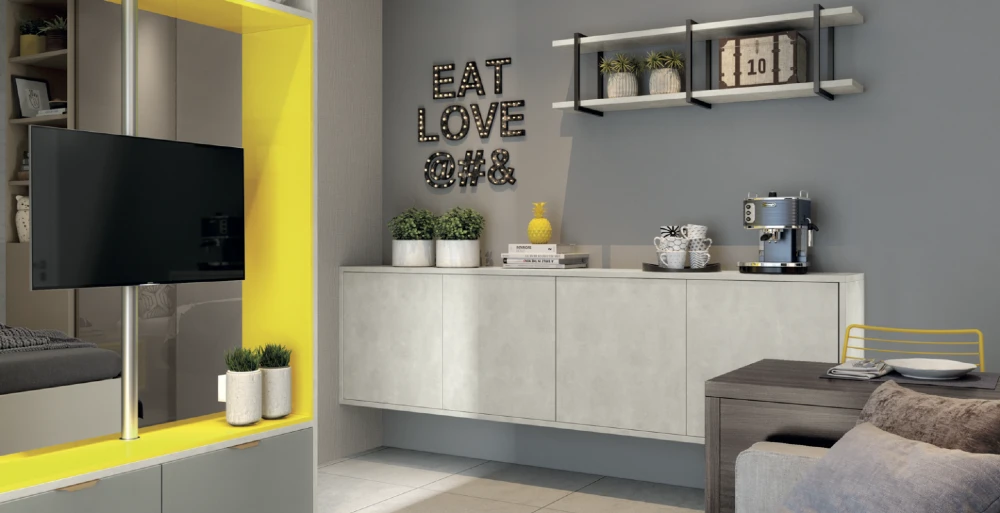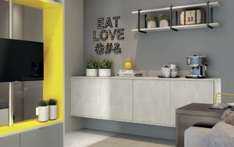 aplicada em ambientes criativos e de convivência, como sala de estar, cozinha e home
