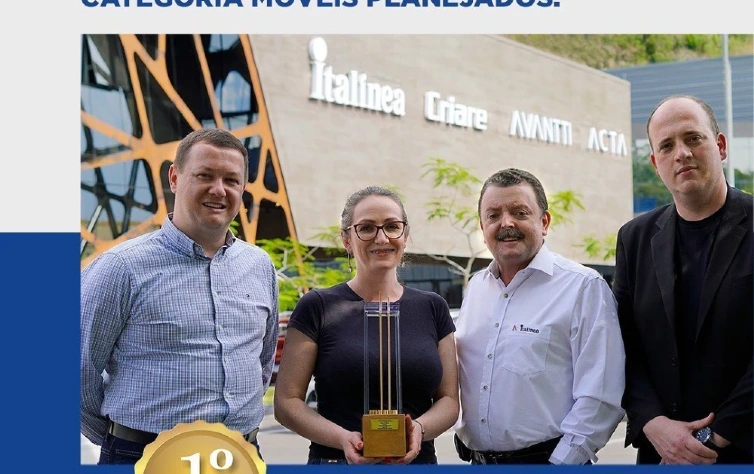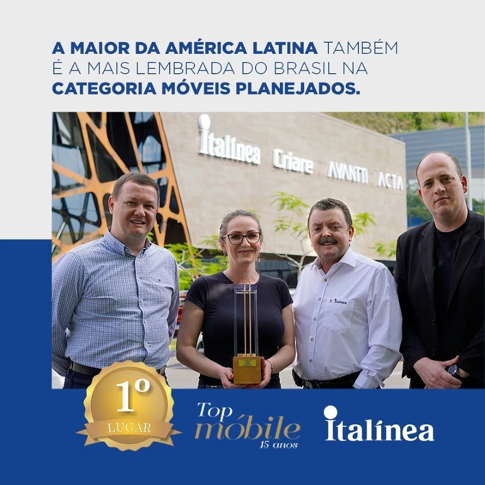 O senhor Ricardo Farina, presidente da Italínea, os diretores e a supervisora de marketing receberam o prêmio do Top Móbile 2020. Pra quem não soube dessa ótima notícia, a Italínea foi a vencedora do prêmio na categoria móveis planejados. Um reconhecimento que nos deixa muito orgulhosos e motivados a fazer o nosso melhor cada vez mais. Obrigado a todos!