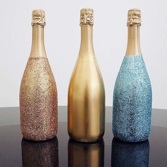 Essa aqui é um encanto: pegue algumas garrafas usadas, higienize-as e pinte com tinta spray dourada. Faça os números em papel emborrachado com brilho e cole nas garrafas. Se quiser, pode decorar com glitter também!