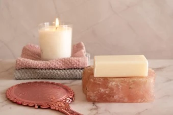 Além de deixar o ambiente perfumado, a vela aromática é delicada para decorar e traz um sentimento de conforto ao banheiro.