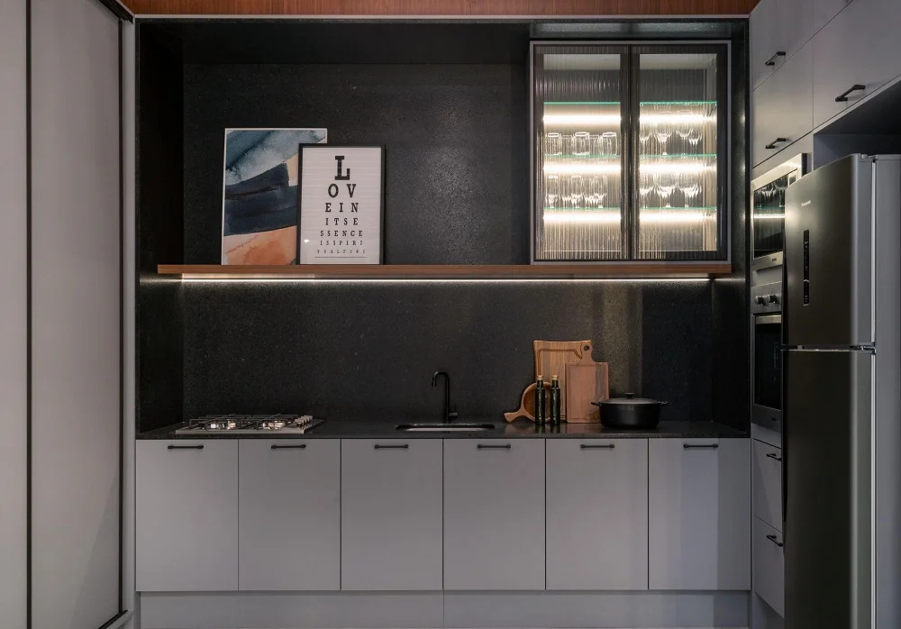 Feito isso, é hora de pensar na disposição dos armários, prateleiras e gavetas em sua cozinha. Uma boa dica de economia aqui são as prateleiras abertas, que não apenas oferecem uma estética moderna, mas também são mais acessíveis economicamente, proporcionando um visual arejado à cozinha.