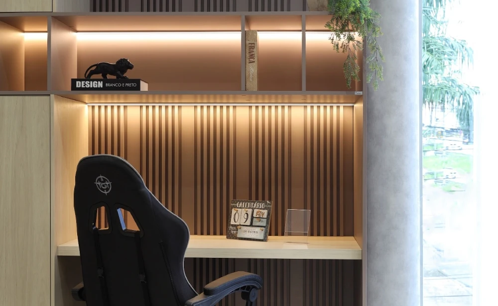 Invista em itens de qualidade e foque sempre no conforto, afinal, você passará muitas horas do seu dia nesse ambiente. Detalhes ergonômicos e funcionais: para garantir conforto durante as longas horas de trabalho, não se esqueça dos pequenos detalhes, pois eles podem transformar seu ambiente. Além de investir em um apoio de teclado e mousepad ergonomicamente projetados, é importante considerar a inclusão de um banquinho planejado como apoio para os pés. Integrado ao conjunto de móveis, esse detalhe pode ter um impacto significativo na sua postura e bem-estar ao longo do dia de trabalho.