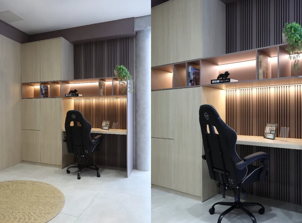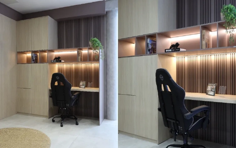Móveis planejados para home office: móveis planejados são essenciais para otimizar o espaço de trabalho. Escolha cores neutras para as mesas e prateleiras, de modo que o ambiente fique organizado e funcional, sem distrações visuais.