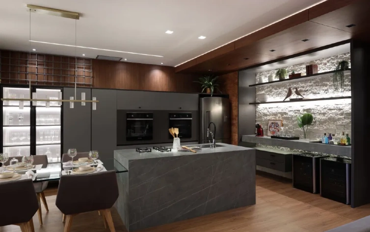 Dicas para armários e bancadas: armários em cinza ou branco combinam perfeitamente com bancadas de mármore ou granito escuro, trazendo um toque sofisticado ao espaço. Móveis planejados permitem otimizar o espaço da cozinha, unindo funcionalidade e estética.