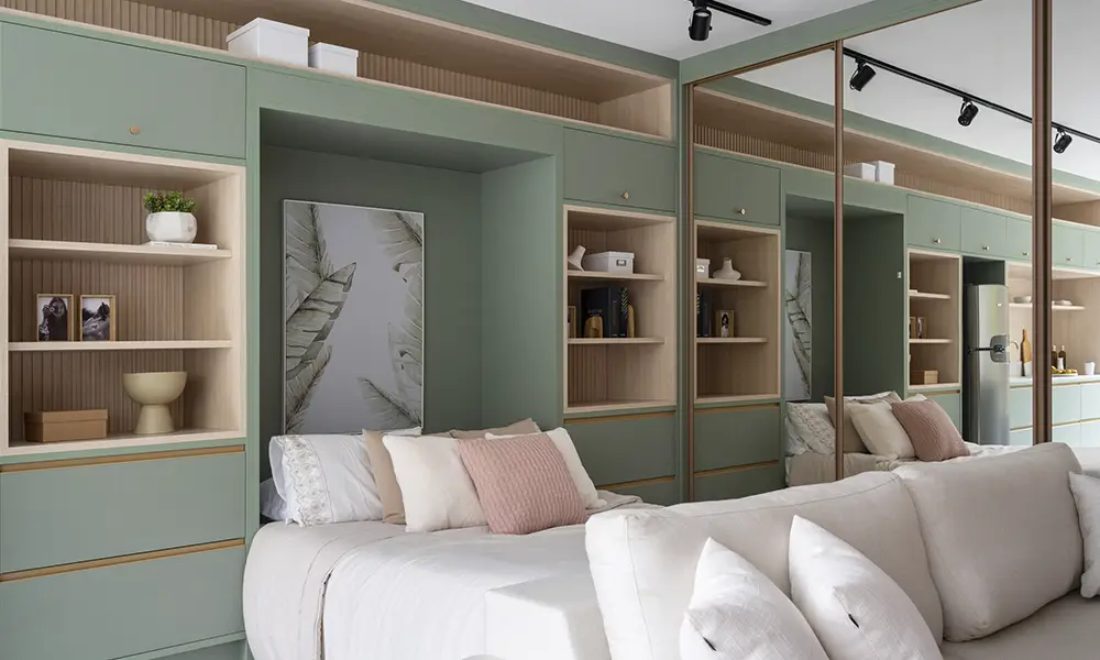 Em quartos menores, o planejamento precisa ser ainda mais preciso. Portas de correr evitam interferência no uso do espaço, espelhos ajudam a ampliar visualmente o ambiente e a divisão interna do armário deve refletir o tipo de roupa e os hábitos de quem utiliza o dormitório. Aproveitar o espaço vertical deixa de ser apenas uma escolha estética e se torna uma solução funcional indispensável.