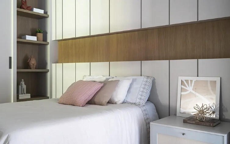 Para que o resultado seja equilibrado, é essencial que o revestimento dialogue com os móveis planejados, considerando cores, texturas e volumes. Aplicações pontuais funcionam melhor, especialmente em dormitórios onde o descanso é prioridade, evitando excessos que podem tornar o ambiente visualmente carregado.