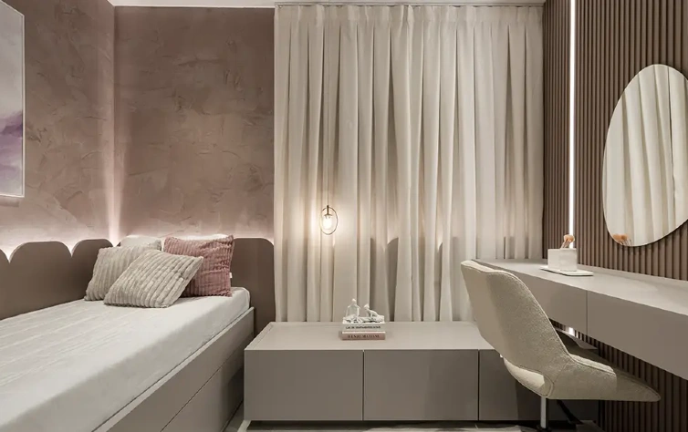 As cores também exercem papel fundamental. Tons claros, neutros e contínuos ampliam visualmente o ambiente e criam sensação de leveza, principalmente quando combinados com acabamentos uniformes. Já os layouts recomendados priorizam circulação fluida, evitando bloqueios visuais e garantindo que o quarto funcione bem no dia a dia. Em projetos bem resolvidos, o quarto pequeno deixa de ser uma limitação e passa a ser um espaço eficiente e acolhedor.